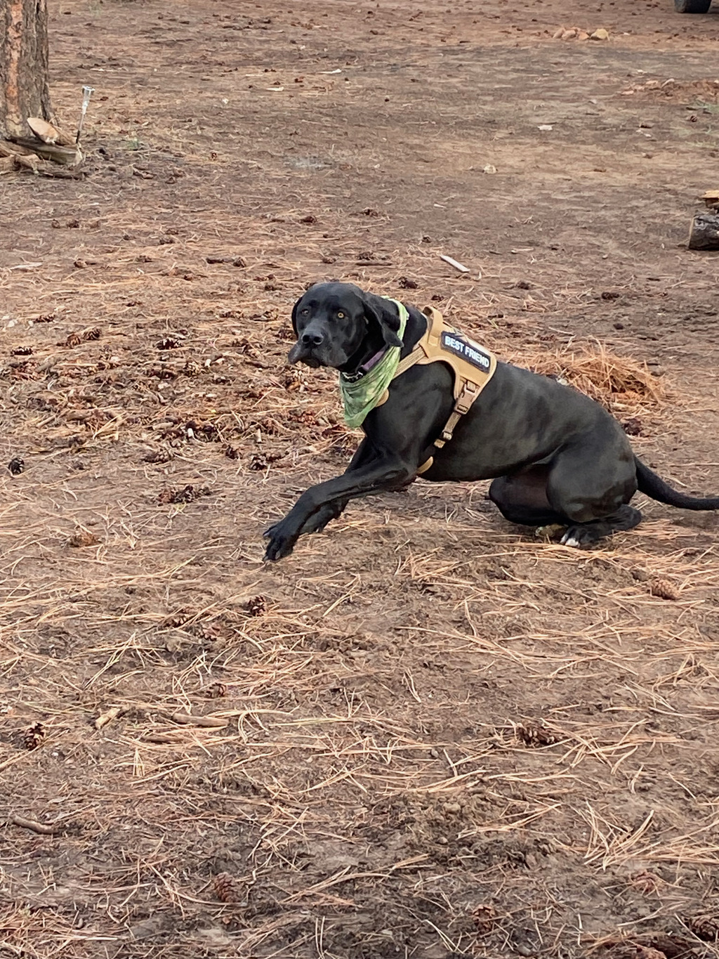Our sweet tempered Mastiff/Great Dane mix loves camping and the outdoors, and hates taking a bath.